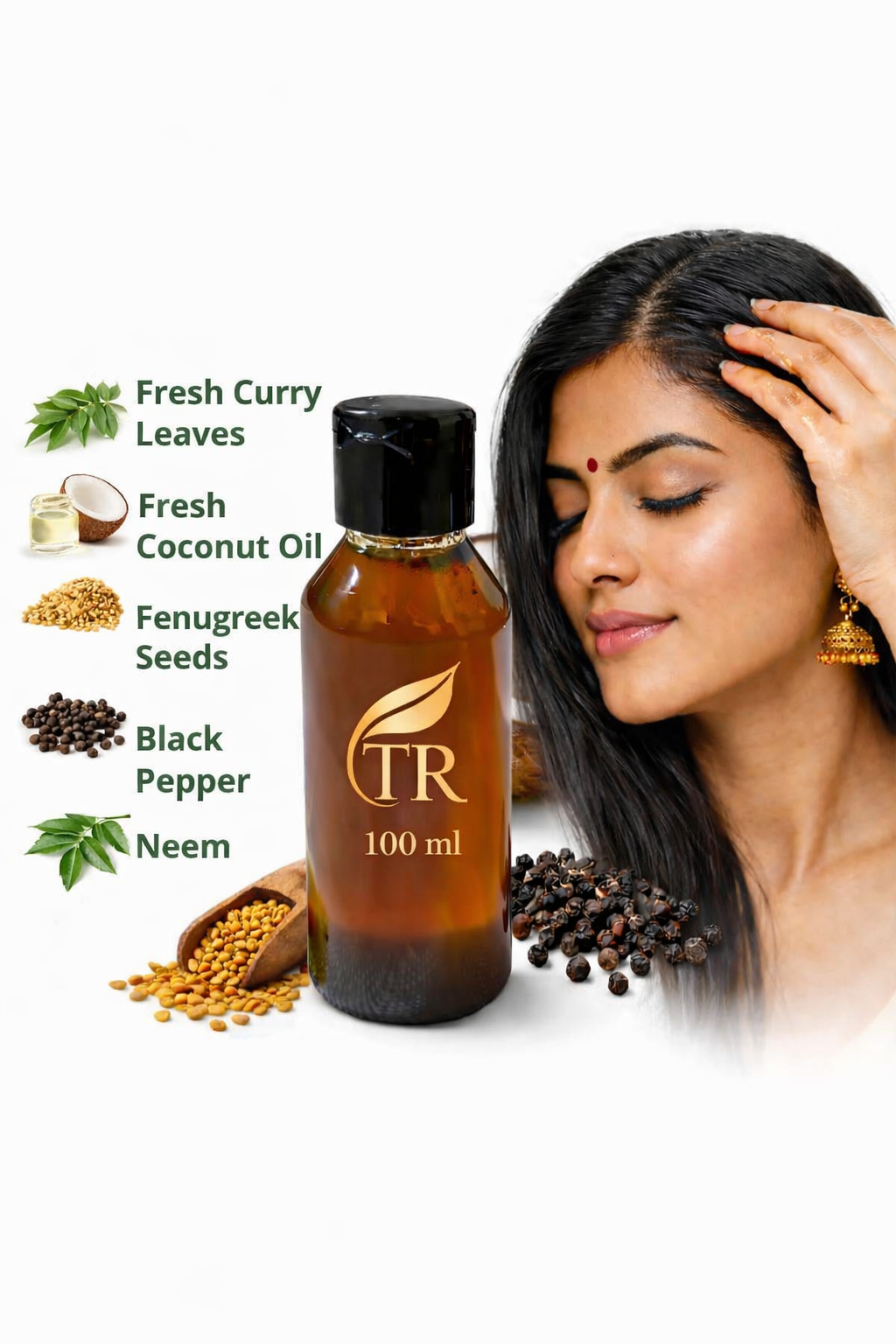Infused with Curry Leaves, Fenugreek Seeds, Coconut Oil & Black Peppercorns and many More ingredients to nourish roots and promote natural hair growth.